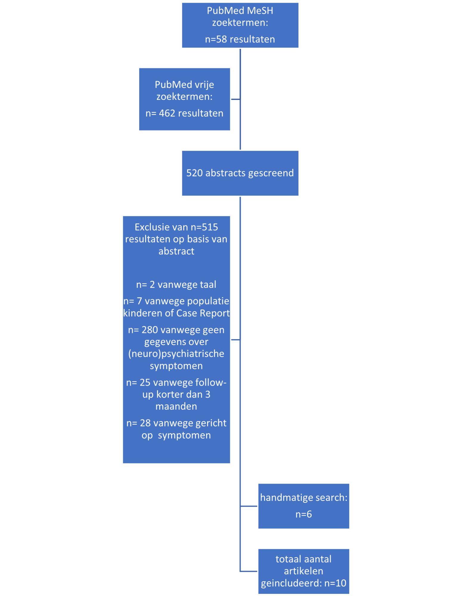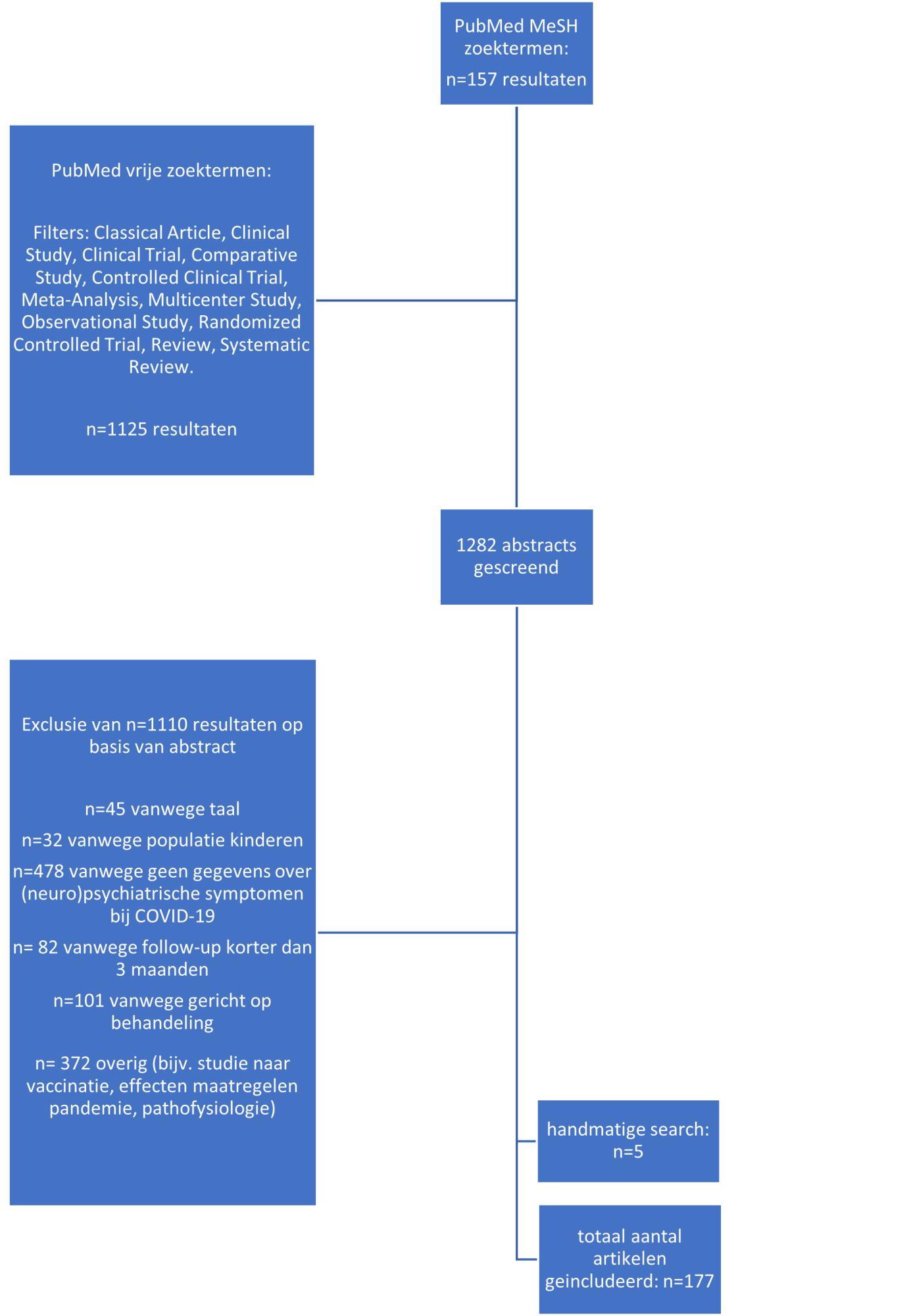 Vervolgens selecteerden we artikelen na bestudering van het abstract op basis van de volgende criteria: Engelse of Nederlandse taal, onderzoekspopulatie volwassenen of ouderen, inhoudelijke geschiktheid waaronder follow-upduur van minimaal 3 maanden na doormaken van COVID-19 en focus op (neuro)psychiatrische klachten. Deze selectie werd gemaakt door een van de auteurs, waarbij de andere auteur een tweede controle deed. Met een handmatige zoekactie voegden we op basis van onze kennis nog enkele relevante, maar door de zoekopdracht gemiste artikelen toe.