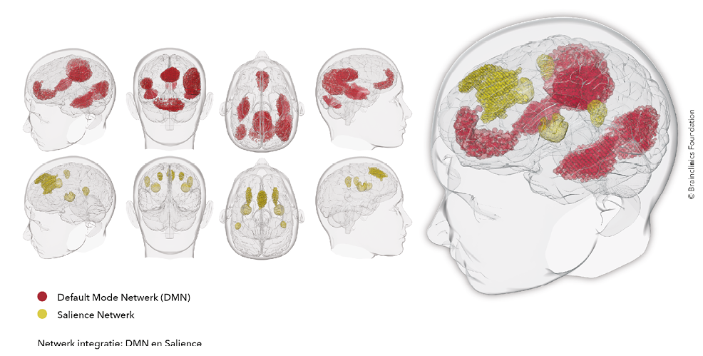 Figuur 1. Defaultmodenetwerk (DMN) en het saliencenetwerk (SN) en de samenwerking van beide in netwerkintegratie; afbeelding: Brainclinics Foundation