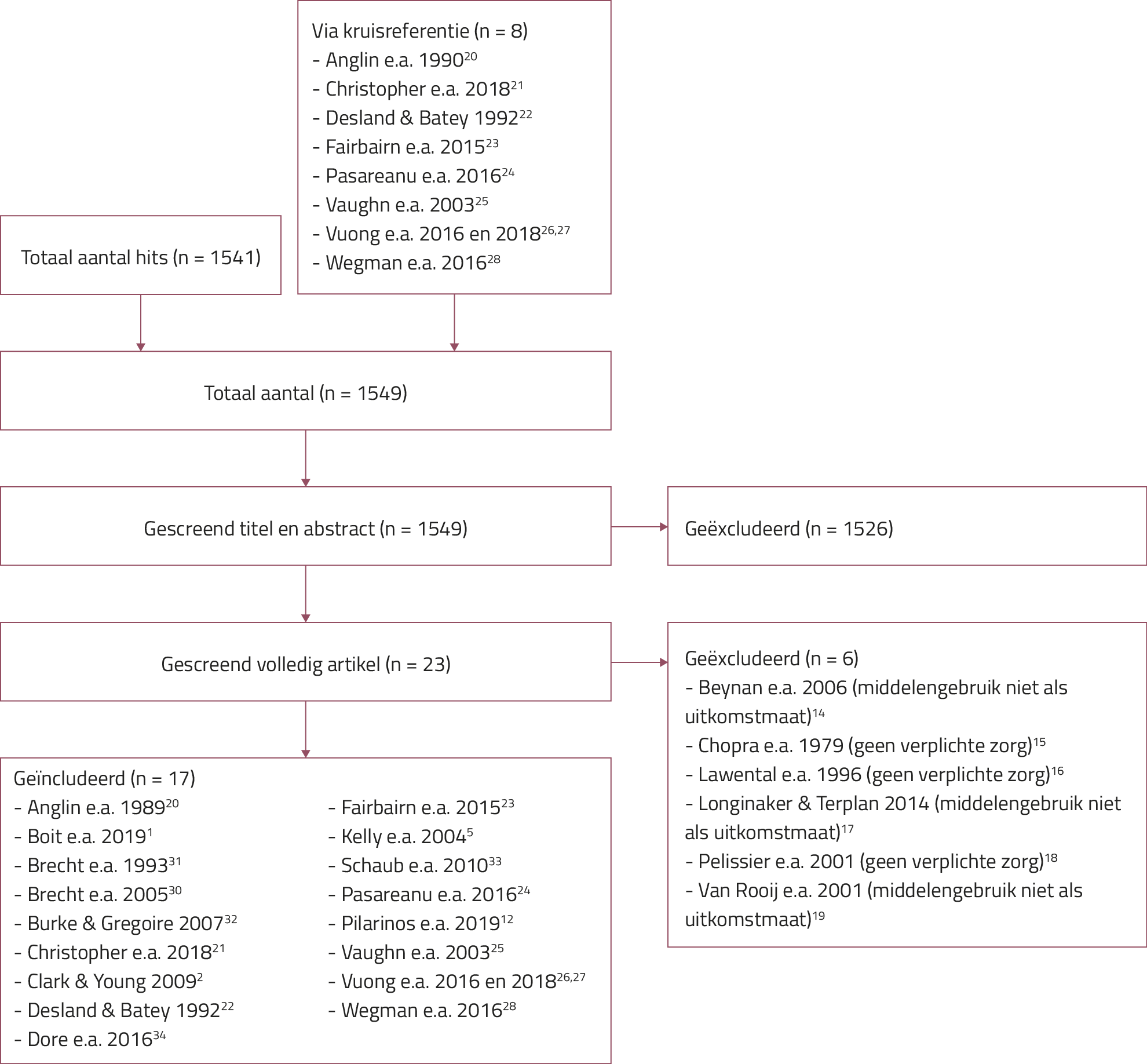 Allereerst bestudeerden we de titels. 1526 studies werden geëxcludeerd op basis van de genoemde in- en exclusiecriteria. Bij discrepantie tussen het oordeel van AN en MvD namen we het oordeel van medeauteur AB mee. Uiteindelijk was er consensus over de inclusie van de artikelen. Na het bestuderen van de 17 volledige artikelen vielen er nog eens 6 af,14-19 zodat er 11 artikelen overbleven. De redenen van exclusie van deze artikelen staan vermeld in figuur 1. Het nagaan van kruisreferenties van de geïncludeerde artikelen en reviews leverde 8 nieuwe artikelen op.20-28