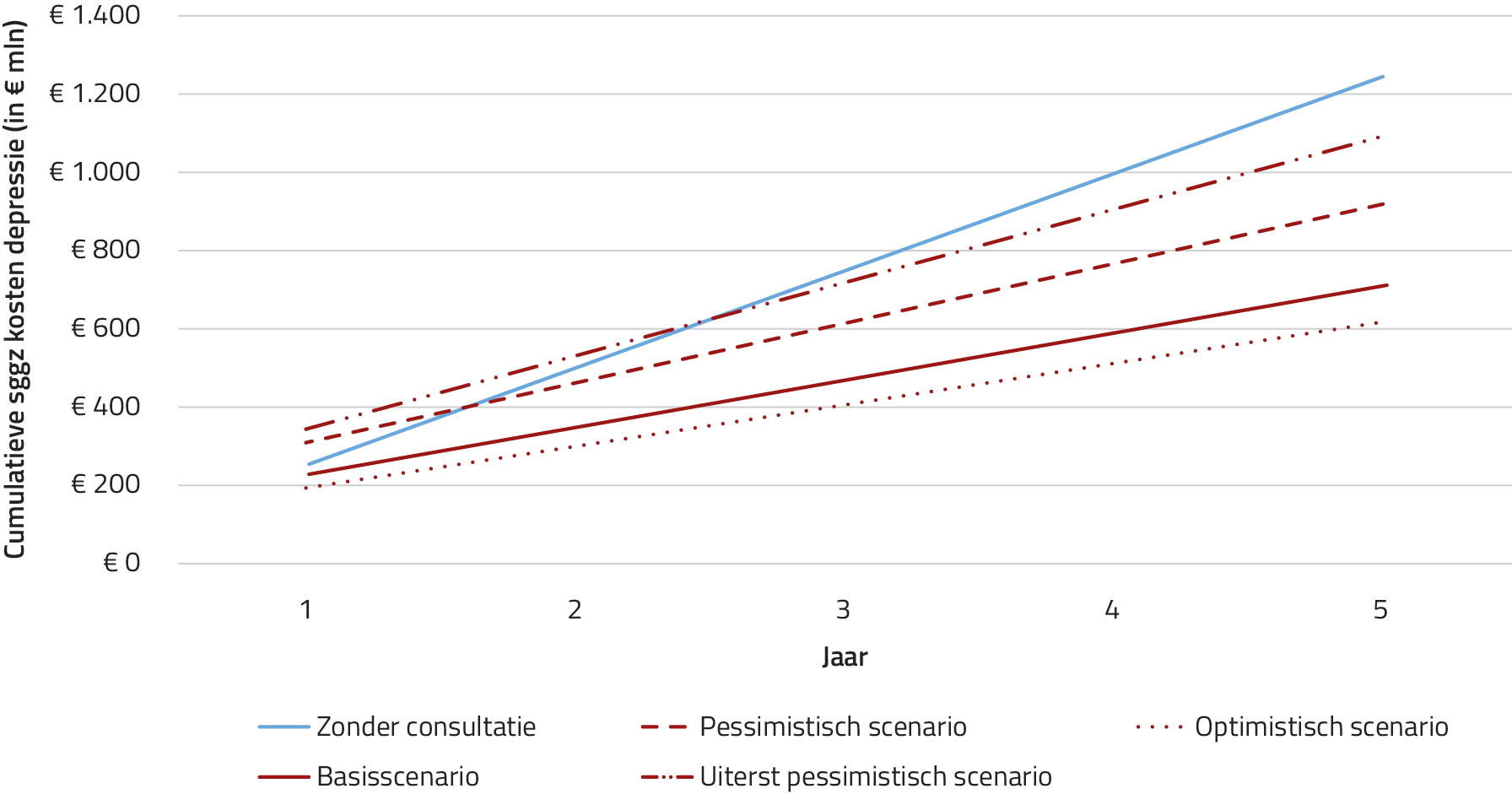 Een investering van bijna € 50 miljoen in consultatie en advies (voor 33.250 patiënten met een persistente depressie à € 1500,-) zou naar verwachting in het eerste jaar een besparing opleveren van bijna € 83 miljoen (70 miljoen prijsniveau 2019) aan sggz-kosten. In de vervolgjaren zou deze besparing € 127 miljoen (€ 107 miljoen prijsniveau 2019) bedragen. Deze groep patiënten was langdurig in zorg. Het effect van de consultatie aan deze groep zou in de jaren daarna doorwerken. Figuur 1 laat zien dat, over de tijd, de verwachte cumulatieve kosten van deze patiëntengroep neerwaarts afgebogen zouden worden en dat het verschil over 5 jaar tijd zou oplopen tot € 533 miljoen (449 miljoen prijsniveau 2019).