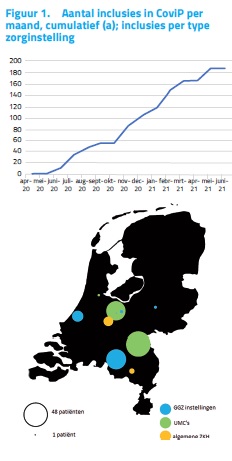 In 2020 toonden 45 zorginstellingen interesse voor deelname, 19 zorginstellingen meldden zich formeel aan bij het casusregister en 10 zorginstellingen leverden data aan. In totaal werden in de periode april 2020-juni 2021 186 patiënten geïncludeerd in het casusregister (figuur 1a), van wie 47% door universitaire medische centra (UMC’s), 38% door ggz-instellingen en 15% door algemene ziekenhuizen (figuur 1b).