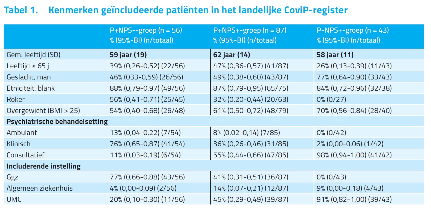 Om inzicht te krijgen in de mogelijke invloed van pre-existente psychiatrische aandoeningen op NPS en het beloop van COVID-19 vergeleken we de P+NPS+-groep met de P-NPS+-groep, tevens door per groep de prevalenties te weer te geven.