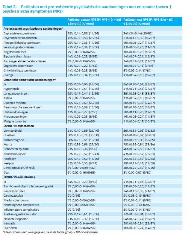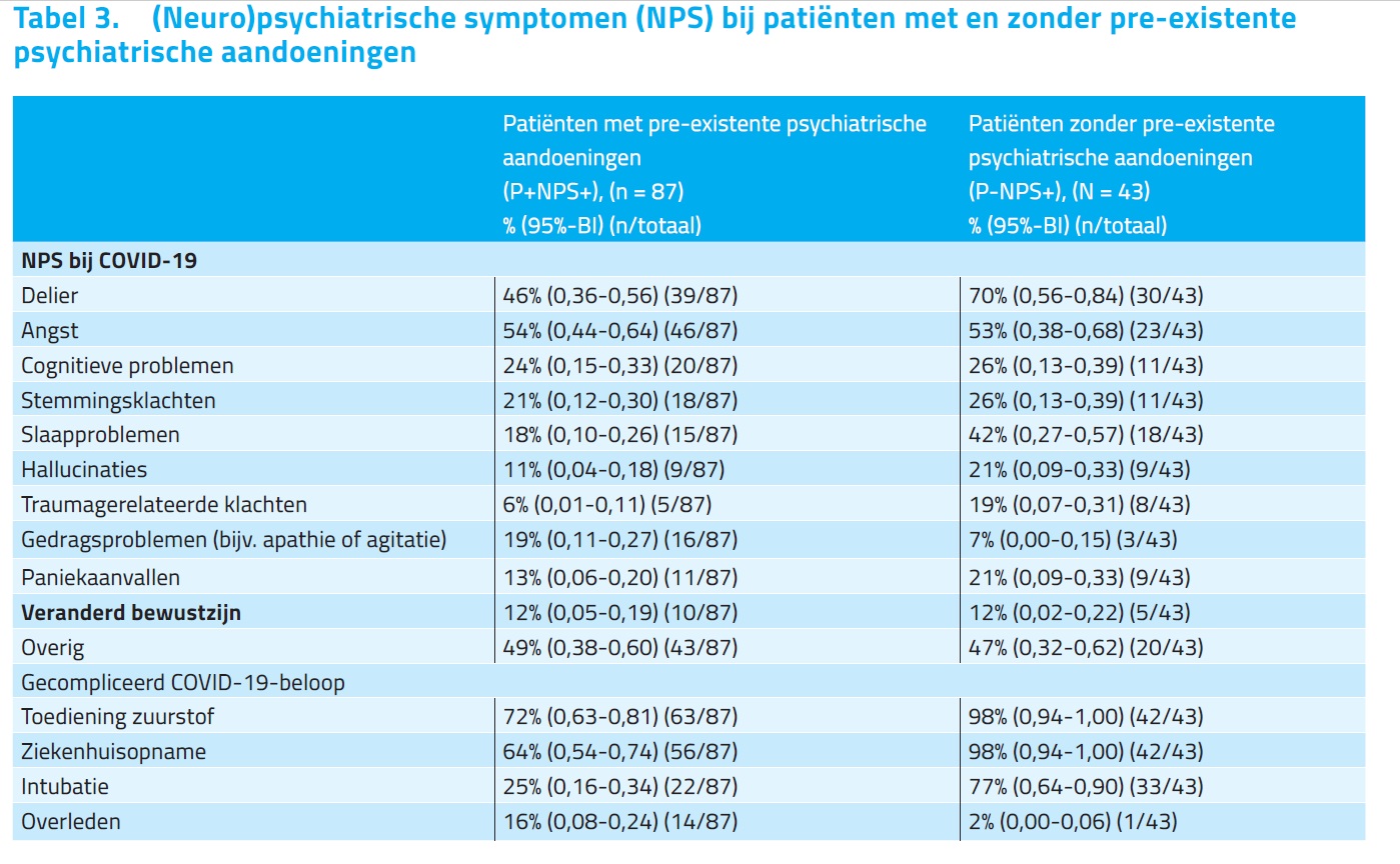 Er werden 186 patiënten in het casusregister geïncludeerd. NPS kwamen vaker voor bij een ernstig COVID-19-beloop. Patiënten met pre-existente psychiatrische aandoeningen met NPS tijdens COVID-19 overleden vaker dan patiënten met NPS zonder pre-existente psychiatrische aandoeningen. De meest voorkomende NPS tijdens COVID-19 waren delier (46-70%), angstklachten (53-54%) en insomnia (18-42%).