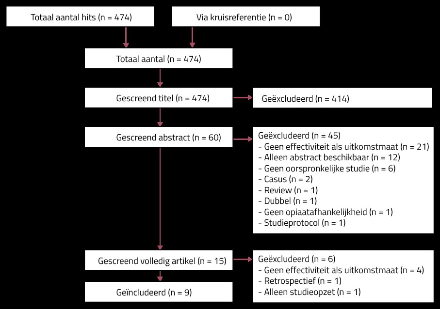 Allereerst bestudeerden we de titels. 414 studies werden geëxcludeerd op basis van de genoemde in- en exclusiecriteria. Na het bestuderen van de abstracts van de overblijvende 60 artikelen vielen nog eens 45 artikelen af en na het bestuderen van het volledige artikel vielen nog 6 studies af, waardoor uiteindelijk 9 artikelen overbleven. De redenen van exclusie van deze artikelen staan vermeld in figuur 1. Het nagaan van kruisreferenties van de geïncludeerde artikelen en reviews over het buprenorfinedepot leverde geen nieuwe artikelen op.