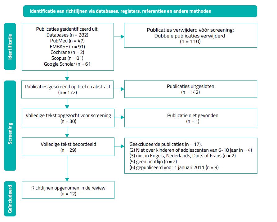 Van de 29 geïdentificeerde richtlijnen voldeden er 12 aan de inclusiecriteria.9-20 Slechts 2 van de 29 richtlijnen werden uitgesloten wegens taalbeperkingen en 9 richtlijnen waren niet recent genoeg. 4 andere richtlijnen werden uitgesloten omdat ze niet over kinderen of adolescenten van 6-18 jaar gingen en nog 2 andere waren geen werkelijke richtlijn maar een controle of studie rond de implementatie van een richtlijn.