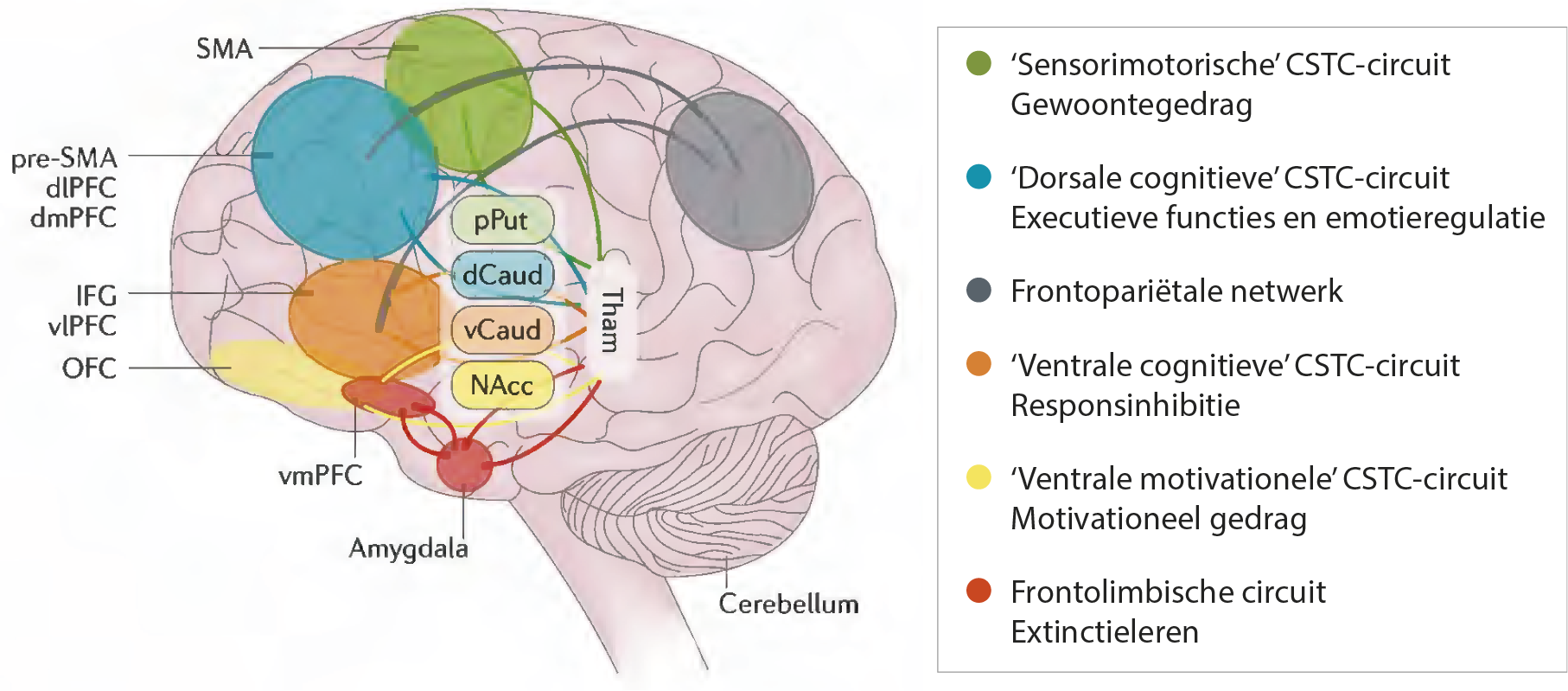 Hersencircuits die betrokken zijn bij sensorimotorische, cognitieve, affectieve en motivationele processen onderliggend aan OCS en de corticale hubs die als target dienen voor rTMS: dlPFC, (pre)SMA, mPFC/ACC, OFC. dCaud: dorsale deel van nucleus caudatus; dlPFC: dorsolaterale prefrontale cortex; mPFC: mediale prefrontale cortex; ACC: cortex cingularis anterior; IFG: inferieure frontale gyrus; NAcc: nucleus accumbens; OFC: orbitofrontale cortex; pPut: posterieure deel van putamen; pre-SMA: presupplementaire motorarea; (pre-)SMA: (pre-)supplementaire motorarea; Tham: thalamus; vCaud: ventrale deel van nucleus caudatus; vlPFC: ventrolaterale prefrontale cortex; vmPFC: ventromediale prefrontale cortex (naar Stein e.a. 2019).2
