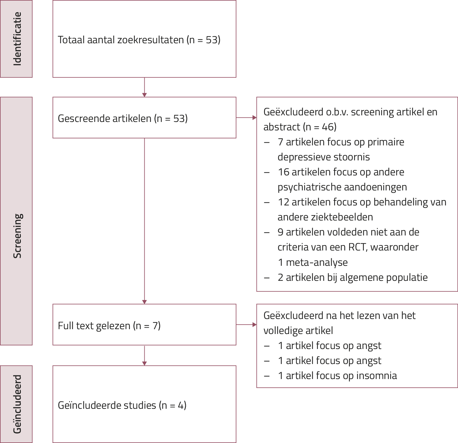 Via PubMed vonden we 53 klinische trials (gepubliceerd tot 1 februari 2024). Studies werden geselecteerd indien de focus van de RCT’s de behandeling betrof van een post-partumdepressie volgens de DSM-4 of DSM-5, het een behandeling betrof met een NAS en met focus op de effectiviteit en de veiligheid. We excludeerden 46 artikelen op basis van titel en abstract en na screening van de volledige tekst nog eens 3 artikelen. Ten slotte voldeden 4 RCT’s aan de inclusiecriteria van dit overzichtsartikel (zie figuur 1). Een aanvullende zoekstrategie op de databanken Embase en ScienceDirect leverde geen extra studies op.
