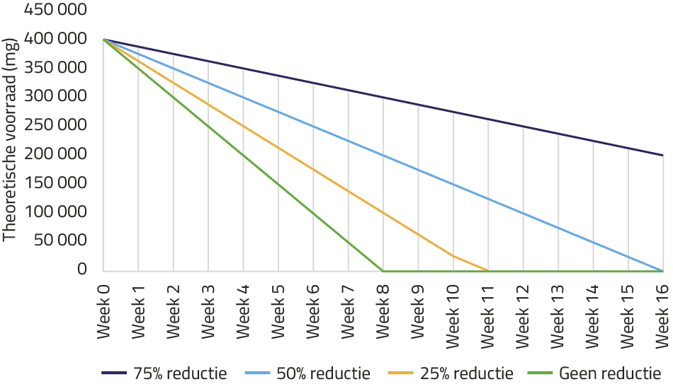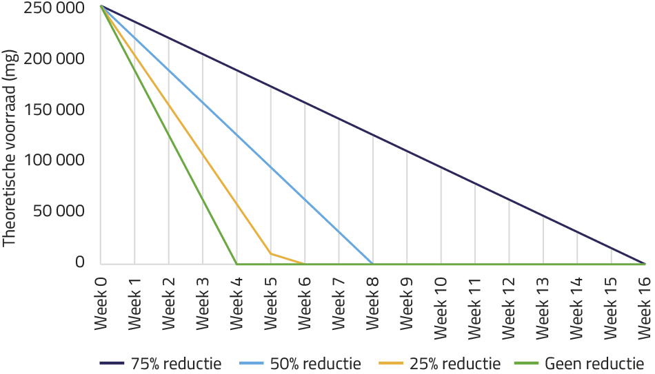 Figuur 1. Voorraadverloop bij verschillende mate van reductie in een uitgangssituatie van 4 weken voorraad