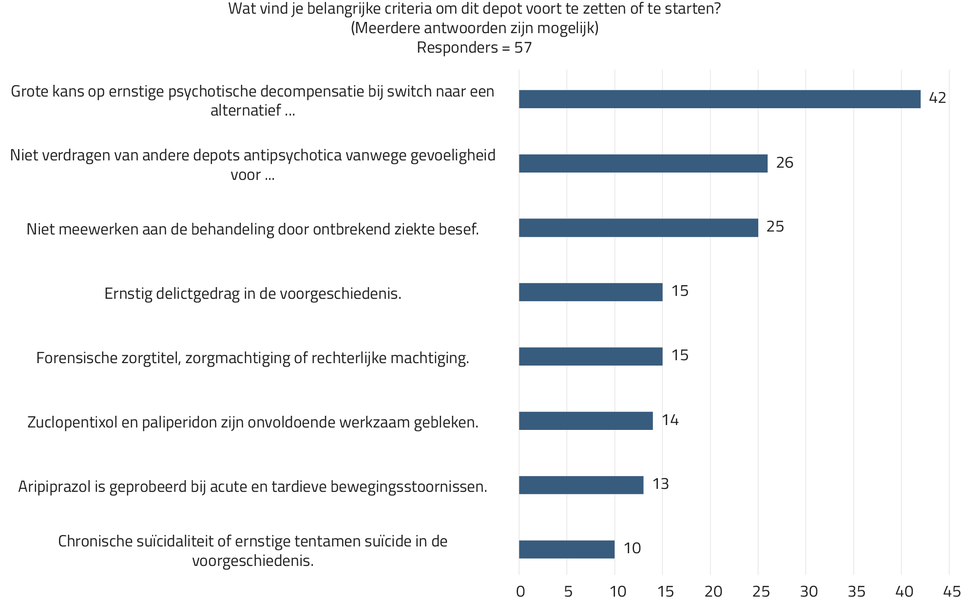 Ten slotte zijn criteria opgesteld voor een codezwartsituatie, wanneer het tekort zo nijpend is, dat tussen patiënten gekozen moet worden. Deze criteria zijn getoetst tijdens een door de commissie ATG georganiseerd webinar voor psychiaters en apothekers op 20 november 2024 (figuur 3). De meerderheid van de 57 aanwezigen kon zich vinden in het volgende voorstel voor codezwartcriteria. Daarbij kan men patiënten doorbehandelen als ze niet meewerken aan de behandeling vanwege ontbrekend ziektebesef en: