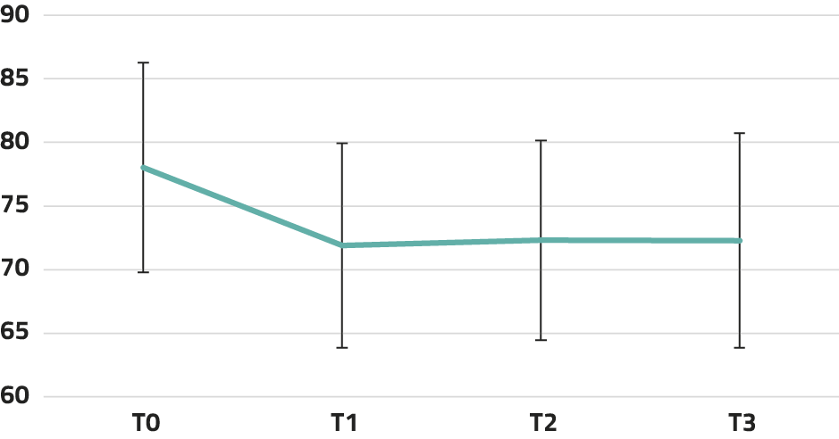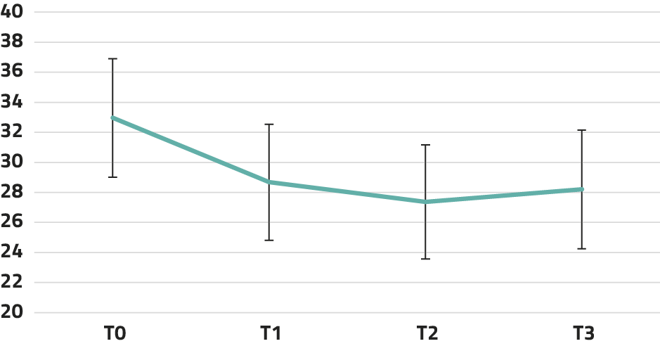 De uitkomsten van LMM-analyses staan in tabel 1. Voor de mate van depressieve klachten en totale ervaren psychische klachten bleek er een significante afname over tijd te zijn. Voor vitaliteit was er geen significant effect over tijd. In figuur 1-3 tonen we de aantallen deelnemers per meetmoment (T0-T3; bereik n = 33-46) en de gecorrigeerde gemiddelde scores per meetmoment, gebaseerd op de modellen uit tabel 1. Er was een afname van de mate van depressieve (ΔT1-T0 = 4,28 en ΔT2-T0 = 5,59) en totale ervaren psychische klachten (ΔT1-T0 = 6,15). Deze effecten bleven bij follow-up behouden.