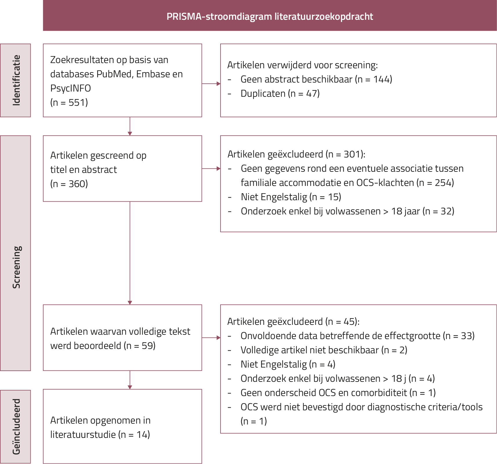 We excludeerden artikelen die: 1. onderzoek bij volwassen patiënten (> 18 jaar) betroffen; 2. geen onderscheid maakten tussen OCS en andere psychische stoornissen; 3. geen data beschikbaar hadden over de effectgrootte van de correlatie tussen familiale accommodatie en OCS-symptomen.