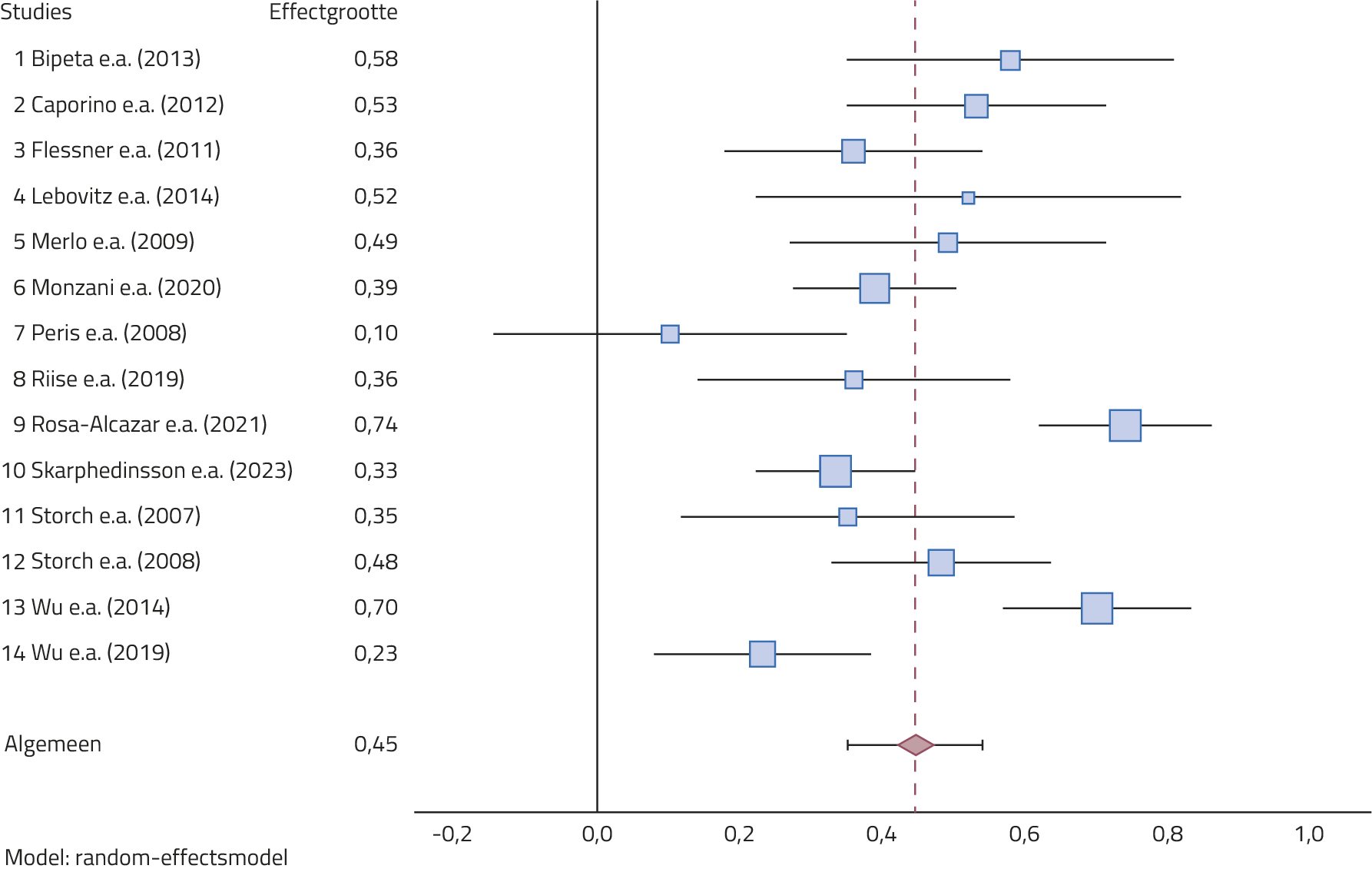 Van de 14 studies betroffen er 11 crosssectioneel onderzoek waarbij de correlatie tussen de ernst van OCS-symptomen en de mate van familiale accommodatie gerapporteerd werd.12-15,17, 18,21-25 In de 3 interventiestudies werden de correlaties berekend bij de uitgangsmeting gebruikt voor de meta-analyse.16,19,20