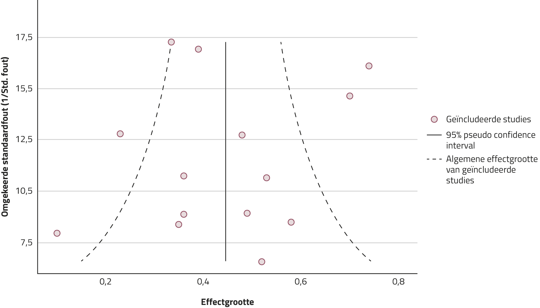 Visuele inspectie van de funnelplot (figuur 3) toont dat de studies symmetrisch rond de gemiddelde effectgrootte verdeeld zijn. Rosenthals fail-safe-N-test toont aan dat er ongeveer 97 niet-gepubliceerde studies met nulresultaten nodig zijn om de waargenomen effectgrootte niet-significant te maken. Dit geeft aan dat het erg onwaarschijnlijk is dat de waargenomen effectgrootte onderhevig is aan publicatiebias.