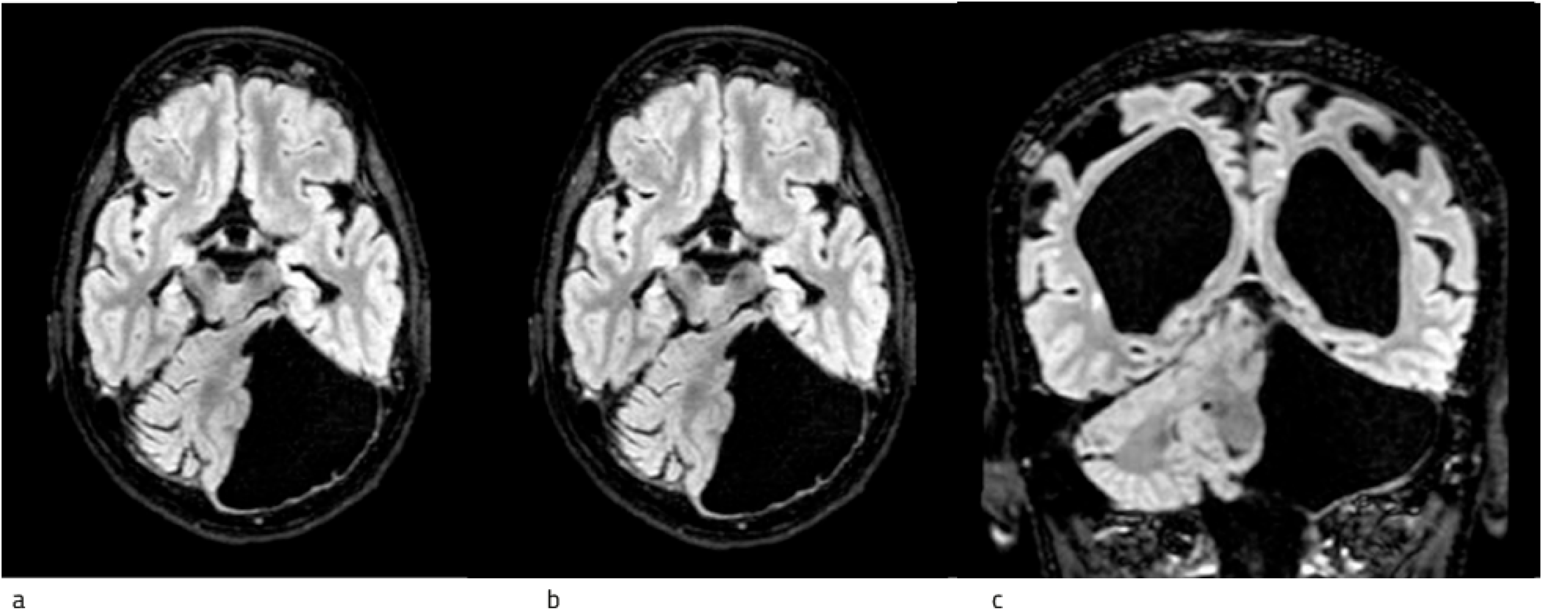 Axiale snede ter hoogte van de temporaalkwab (a), axiale snede ter hoogte van de basale ganglia (b), coronale snede ter hoogte van het cerebellum (met ook secundaire hydrocefalie zichtbaar) (c); FLAIR: fluid attenuated inversion recovery.