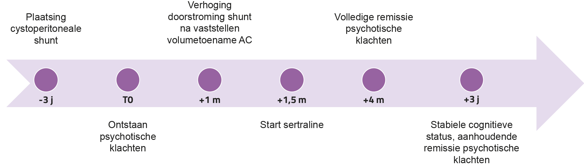 Drie maanden na de verhoging van de doorstroming via de shunt en negen weken na het opstarten van sertraline rapporteerden patiënte en partner een volledige remissie van zowel de psychotische symptomen als de angstklachten. Achteraf was de patiënte terughoudend om over de klachten te spreken vanuit schaamte. De cognitieve klachten daarentegen bleven onveranderd aanwezig (MMSE-score 25/30). Figuur 2 biedt een chronologisch overzicht van het verloop van deze casus.