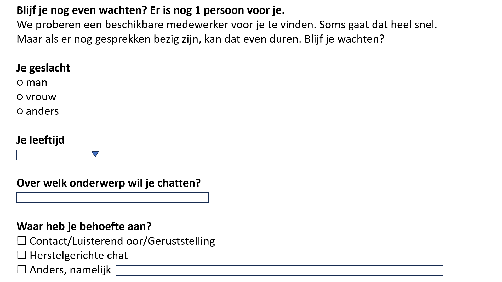 In 2020 lanceerde PsychoseNet.nl de chatfunctie, die bezoekers de mogelijkheid biedt om online en anoniem in gesprek te gaan met daartoe opgeleide medewerkers. Momenteel kunnen bezoekers dagelijks gebruikmaken van de chatfunctie tussen 9:00 en 22:30 uur. Bij het starten van de chat krijgt elke bezoeker de gelegenheid om een gebruikersnaam te kiezen en een leeftijdscategorie (10-20, 21-30, 31-40, 41-50 of 50+), voertaal (Engels of Nederlands) en geslacht (man/vrouw/anders) op te geven. Daarnaast wordt gevraagd naar de behoefte van de bezoeker (geruststelling/advies/contact of een luisterend oor/anders, namelijk…), en heeft de bezoeker de mogelijkheid een gespreksonderwerp te formuleren (zie figuur 1). De ondersteuning via de chat is in principe eenmalig. Eventueel is het mogelijk een zogenaamd ‘5x-traject’ aan te gaan (vijf ontmoetingen om verdiepend op de meest relevante thema’s voor herstel in te gaan vanuit een ontwikkelingsperspectief – zie hierna).