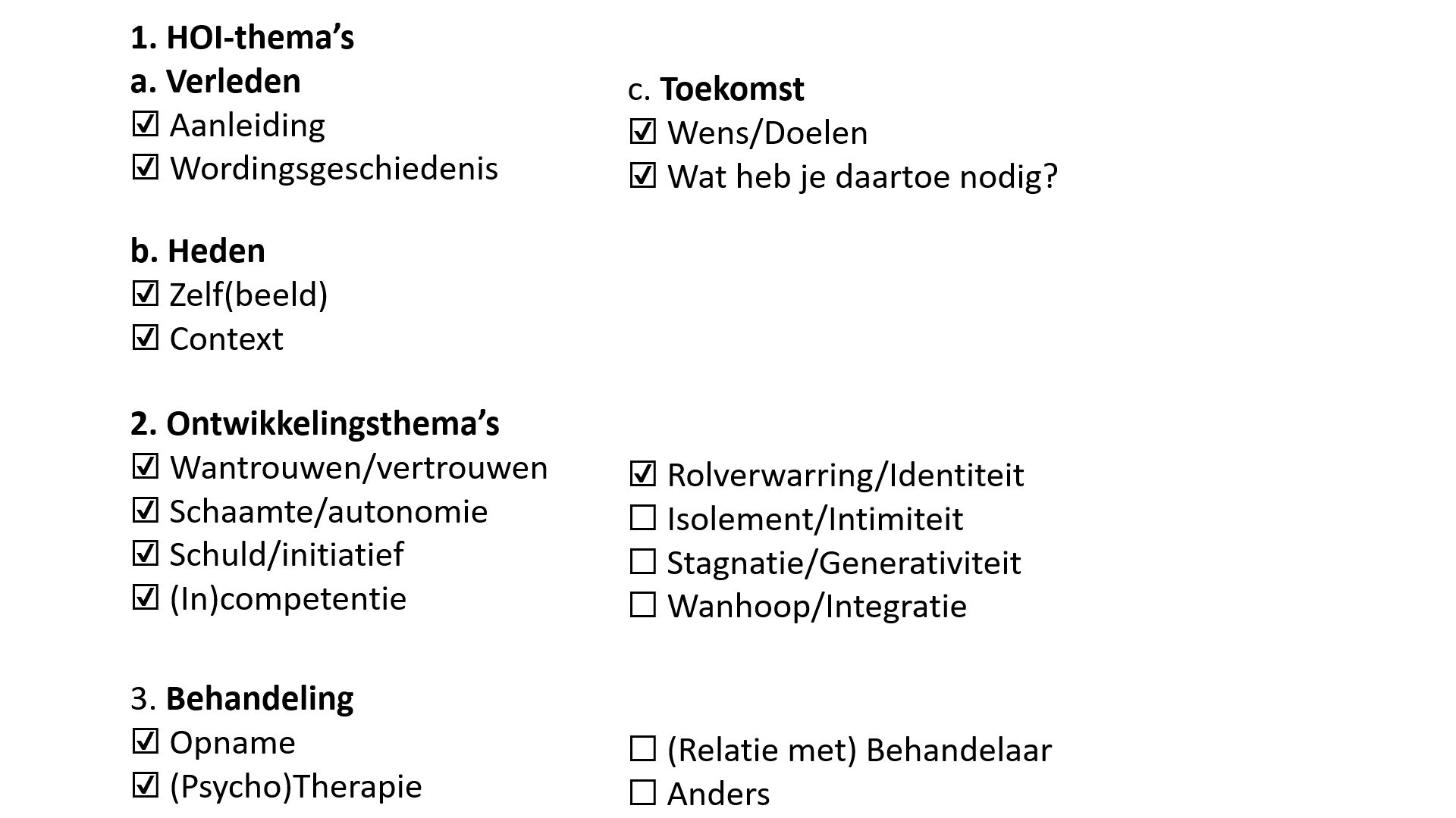 Bij de HOC hanteren we een ontwikkelingsperspectief gebaseerd op – onder andere – de psychologische ontwikkelingsfasen van Erik Erikson.10 Dit biedt houvast en structuur in de gesprekken, doordat psychische kwetsbaarheid en herstel worden geplaatst binnen de bredere context van levensfasespecifieke uitdagingen. Erikson benadrukt in zijn model dat elk individu door cruciale psychosociale fases gaat waarin specifieke vragen en conflicten centraal staan, zoals identiteitsontwikkeling, autonomie, verbondenheid en zingeving.