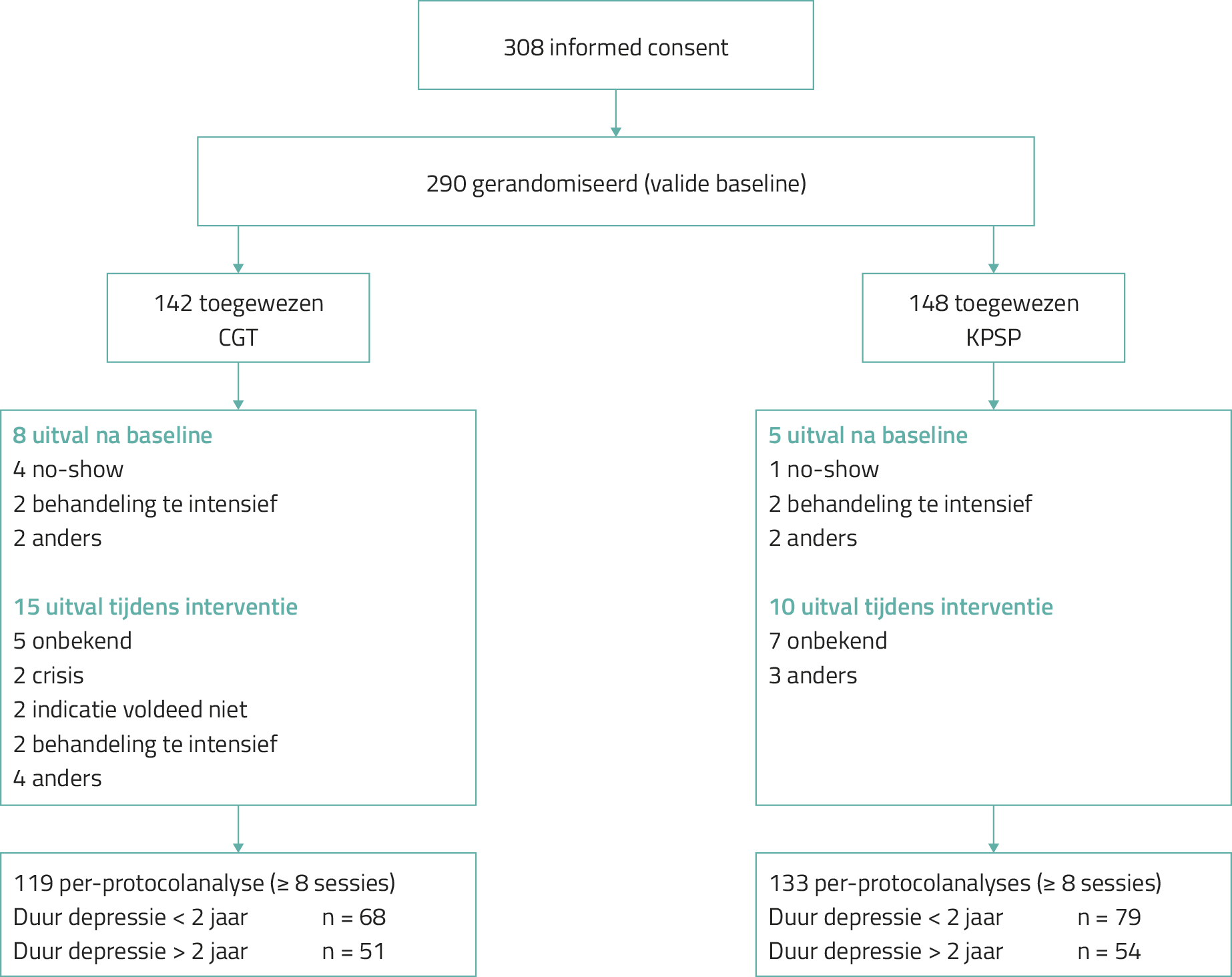 Voor deze studie gebruikten we data uit fase 1 (een gerandomiseerde non-inferioriteitsstudie) van het D*Phase-psychotherapieonderzoek waarin 290 patiënten met een matige of ernstige depressieve stoornis willekeurig werden toegewezen aan CGT of KPSP.13,14 Het D*Phase-onderzoek werd geregistreerd in het Nationaal Trial Register (trial-ID: NTR6019) en werd goedgekeurd door de medisch-ethische commissie van Medisch Centrum Leeuwarden (RTP0970, registratienummer NL56047.099.16, 21 juli 2016).