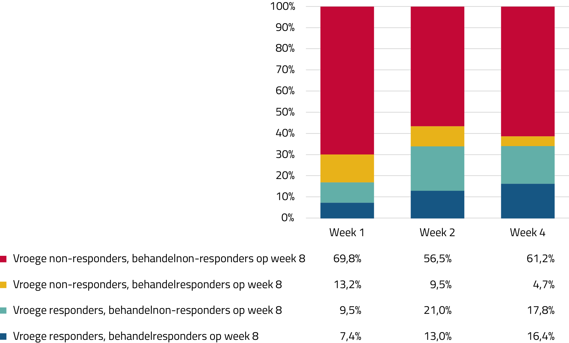 Figuur 2. Percentage vroege responders en vroege non-responders in week 1, 2 en 4 met behandelrespons of -non-respons aan het einde van de behandeling