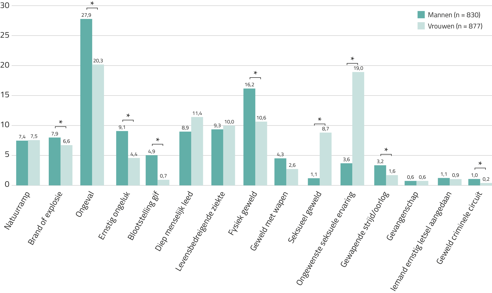 We vonden dat de meeste mensen (81,5%) ten minste één PTE hebben meegemaakt. Verkeersongevallen (24,0%), fysiek geweld (13,3%) en ongewenste seksuele ervaringen (11,6%) waren de meest voorkomende gebeurtenissen die mensen zelf meemaakten. In vergelijking met de vorige prevalentiestudie lijken veel PTE’s ongeveer even vaak voor te komen, zoals brand of explosies (7,2% nu versus 7,5% toen), natuurrampen (7,5% nu versus 6,1% toen) en levensbedreigende ziektes (9,7% nu versus 10,7% toen). Sommige PTE’s lijken nu vaker voor te komen zoals verkeersongevallen (24,0% nu versus 15,5% toen) en gevangenschap (0,6% nu versus 0,3% toen), terwijl fysiek geweld (13,3% nu versus 17,2% toen) en geweld met wapen (3,4% nu versus 10,9% toen) juist minder lijken voor te komen. Sommige PTE’s konden niet direct vergeleken worden zoals seksueel geweld (5,0% nu) omdat het bij de vorige prevalentiestudie anders is uitgevraagd (verkrachting als kind (3,7%) of volwassene (2,7%)).