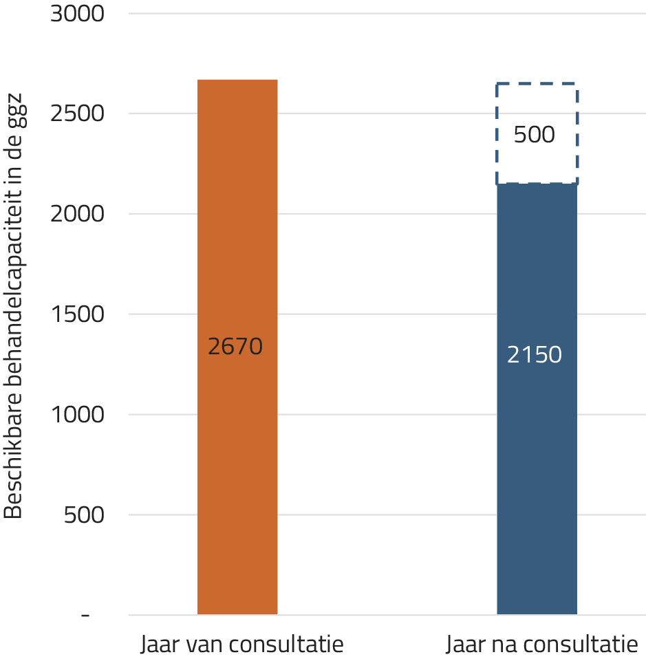 Beschikbare capaciteit binnen de ggz. Voor de impact van consultatie bij eetstoornissen op de beschikbare capaciteit binnen de ggz maakten we een schatting hoeveel capaciteit zou vrijkomen door succesvolle behandelingen. Hierbij was onze aanname dat ook na een succesvolle behandeling jaarlijks enige behandeling nodig zou zijn om het effect vast te houden. De vrijgekomen capaciteit binnen de ggz werd omgerekend naar hele patiënten.