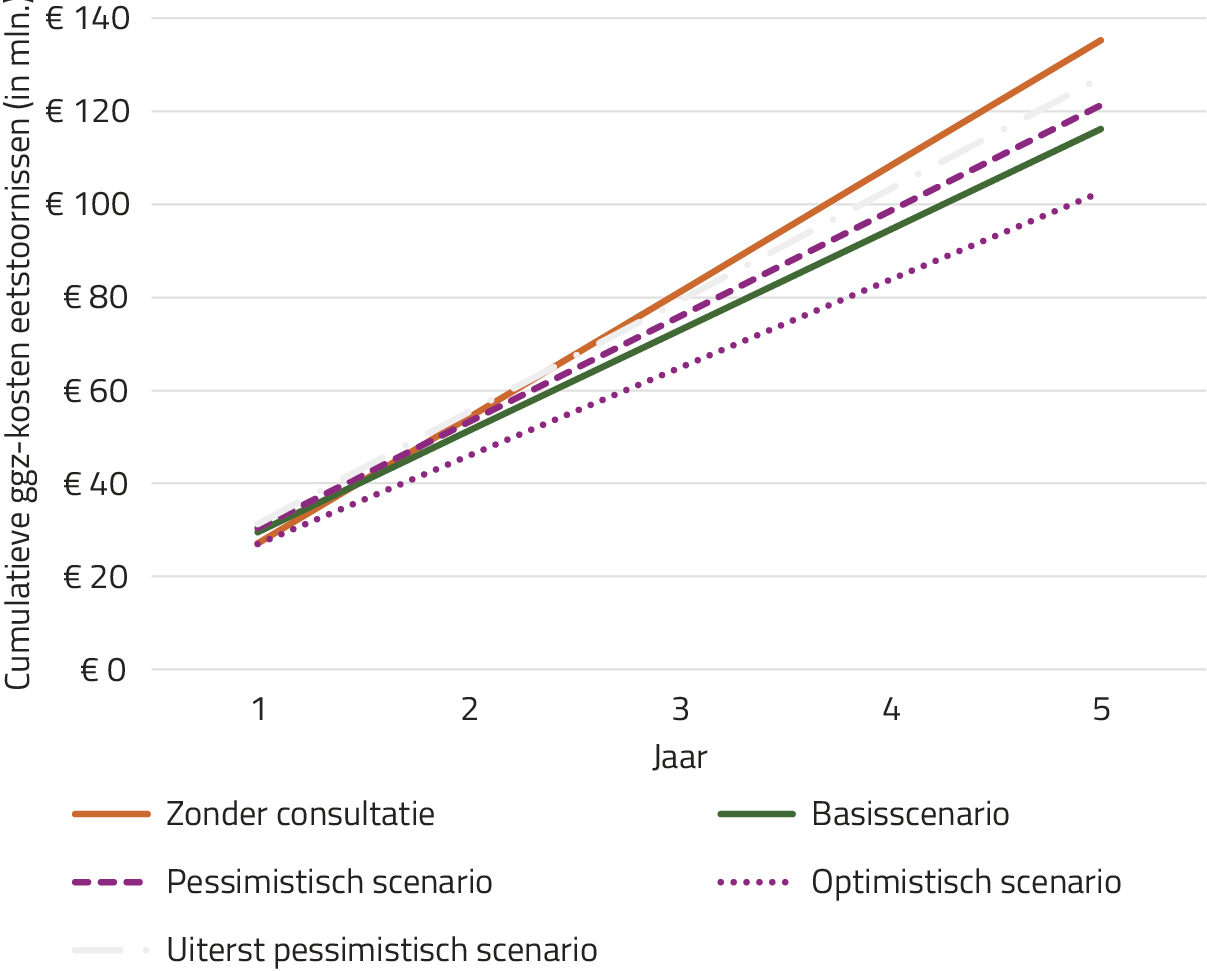 Vermindering directe ggz-kosten. Een investering van € 4,0 miljoen in consultatie (voor 2670 patiënten met een langdurige eetstoornis à € 1500) zou naar verwachting in het eerste jaar een besparing aan sggz-behandelkosten opleveren van € 2,3 miljoen (1,9 miljoen prijsniveau 2019) exclusief consultatiekosten. In de vervolgjaren zou consultatie een besparing opleveren van € 5,4 miljoen (€ 4,5 miljoen prijsniveau 2019). Deze groep patiënten is langdurig in zorg. Daarom zou het effect van consultatie aan deze groep in de jaren daarna doorwerken. Over de tijd zouden de verwachte cumulatieve kosten voor deze patiëntengroep dalen en het verschil over vijf jaar tijd zou oplopen tot € 19,0 miljoen (€ 16,0 miljoen prijsniveau 2019) (figuur 2).