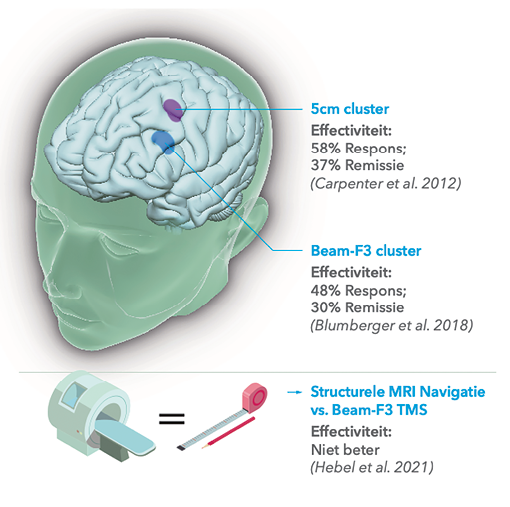 Op basis hiervan werd ook de nieuwe Beam-F3-heuristiek verder gevalideerd,6 die met een aantal metingen aan het hoofd een locatie oplevert op het voorhoofd, vlak in de buurt van het F3-coördinaat zoals in elektro-encefalografie(eeg)-onderzoek wordt gebruikt. Gratis software om deze methode eenvoudig toe te passen is te vinden op: http://www.clinicalresearcher.org/software.htm. Van de Beam-F3 methode is aangetoond dat die tot een adequate locatiebepaling leidt die weinig verschilt van die met MRI-neuronavigatie.7 Grote effectiviteitsstudies met de Beam-F3-heuristiek laten een remissie zien van 30%,8 vergelijkbaar met de eerdere 5-centimeterheuristiek. Een recent gerandomiseerd vergelijkend onderzoek waarbij structurele MRI-navigatie werd vergeleken met niet-genavigeerde ‘Beam-F3’-TMS, liet geen enkel voordeel zien voor MRI-genavigeerde TMS na een futiliteitsbeoordeling.9